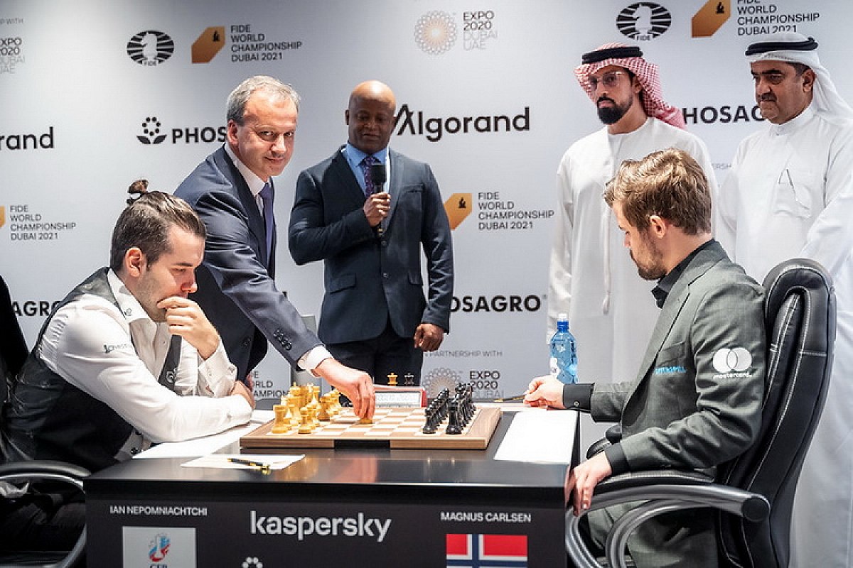 Сыграна первая партия матча за звание чемпиона мира между Яном Непомнящим (Россия) и Магнусом Карлсеном (Норвегия). Она прошла в это пятницу 26 ноября в Дубае (ОАЭ). Аркадий Дворкович - президент ФИДЕ, сделал первый символически ход. На сцене такж ...